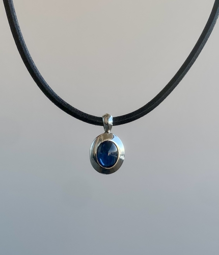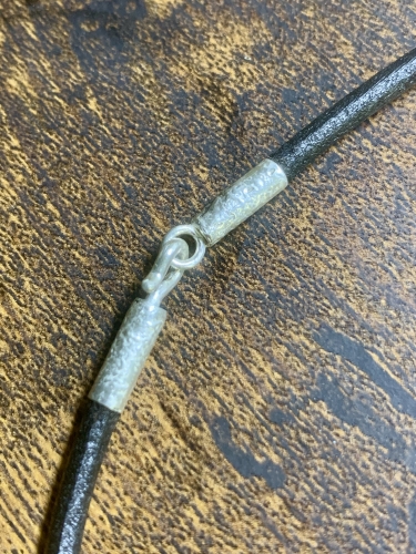 また、革紐の質感に合わせてエンドパーツを制作。身に着けたときはほぼ黒い石に見え、光にかざすとブルーがわかる感じに仕上げました。気に入って頂いたようでうれしい嬉しい限りです。