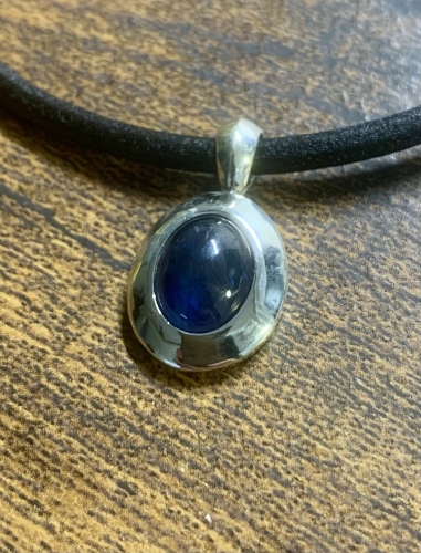 また、革紐の質感に合わせてエンドパーツを制作。身に着けたときはほぼ黒い石に見え、光にかざすとブルーがわかる感じに仕上げました。気に入って頂いたようでうれしい嬉しい限りです。